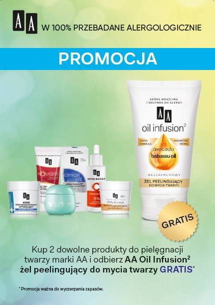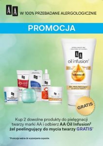 Sierpień 29, 2017Sierpień 29, 2017 by mirpol Comment Closed Promocja kosmetyków marki AA Przy zakupie 2 dowolnych produktów do pielęgnacji twarzy marki AA, żel peelingujący do mycia twarzy AA Oil Infusion² otrzymasz GRATIS. Zapraszamy na nasze stoisko z kosmetykami. Przyjdź i skorzystaj z naszej promocji 🙂